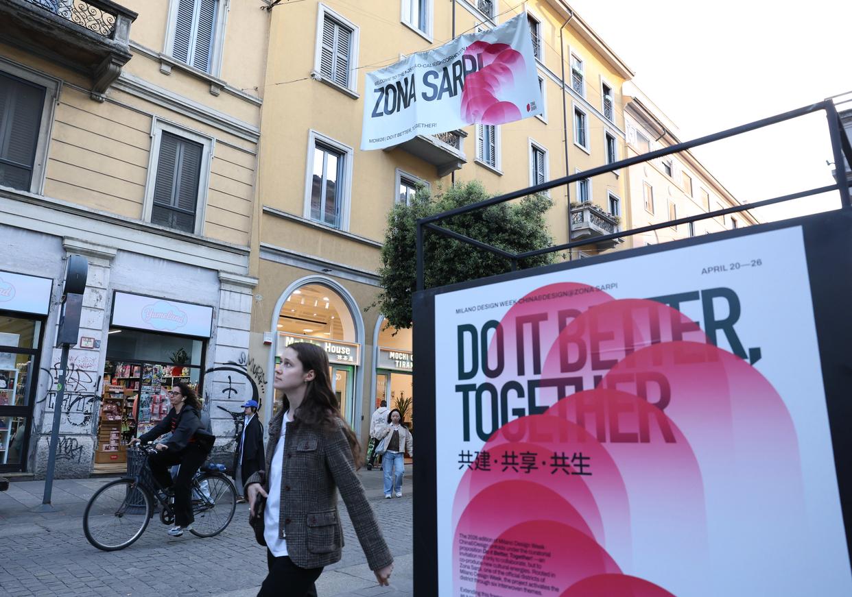 4月22日,在意大利米兰保罗·萨尔皮街区,人们经过米兰设计周“中国设计周”海报。新华社记者 李京 摄