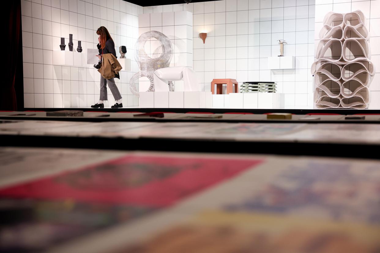 4月22日,在意大利米兰国际会展中心,一名女子在米兰家具展中国美术学院展位参观。新华社记者 李京 摄