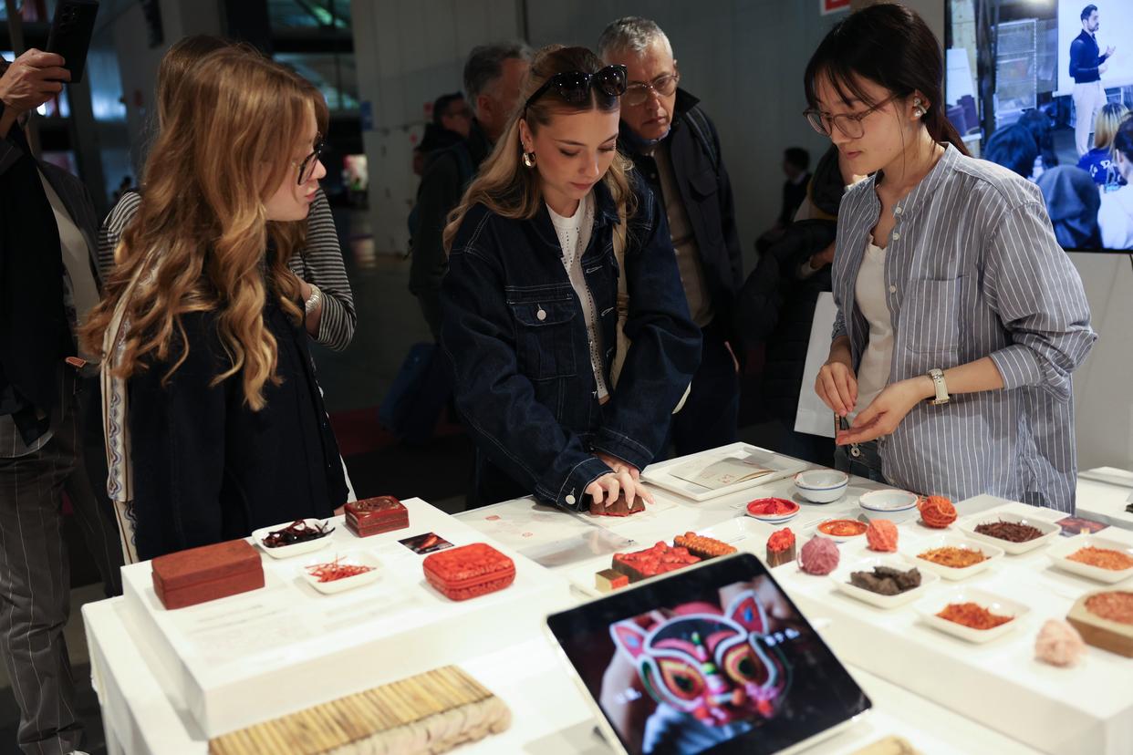 4月22日,在意大利米兰国际会展中心,人们在米兰家具展上体验使用“鲁庵印泥”制作图案。新华社记者 李京 摄