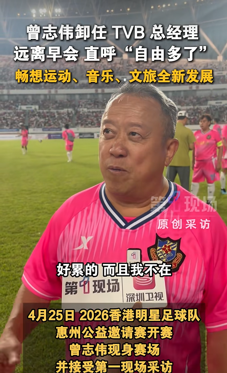 4月25日,2026香港明星足球队惠州公益邀请赛开赛,曾志伟现身赛场,并接受第一现场采访,谈及卸任TVB总经理后他直言“自由多了!如果在TVB,每个星期起码有4天要开会,早上9点钟就要回公司,好累的!”同时曾志伟透露未来规划,希望整合资源,将运动、音乐与旅游业跨界联动融合。