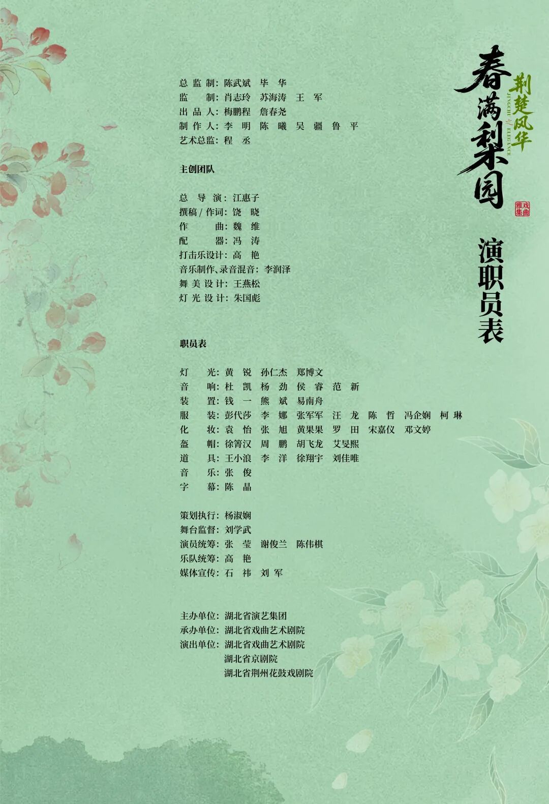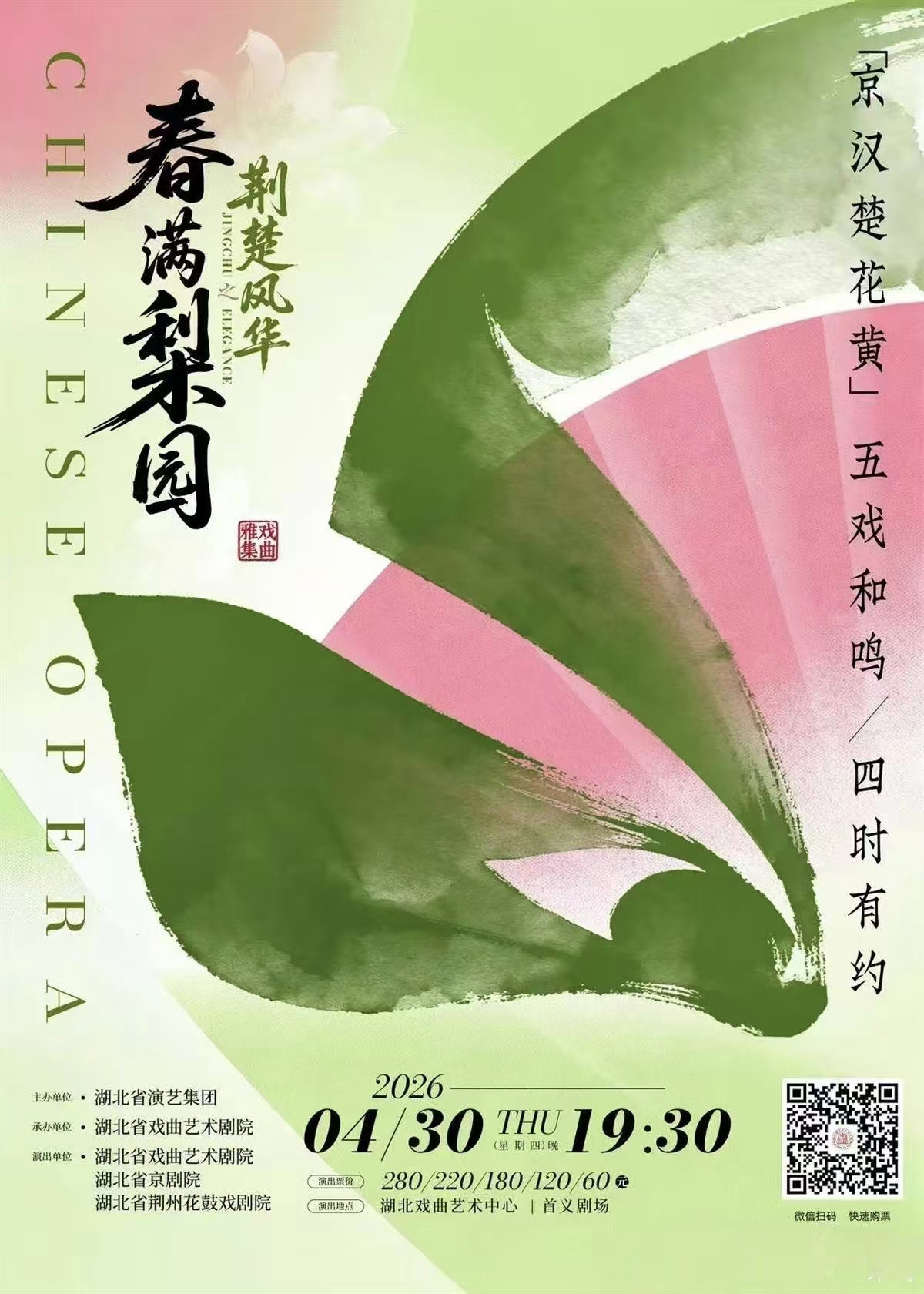 同时,该演出蕴藏着三代人的接力与传承。演出特邀中国戏剧梅花奖得主詹春尧、程丞领衔演出楚剧《东方税官》、黄梅戏《女驸马》等经典选段;京剧名家尹章旭将倾情演绎京剧《沙家浜》选段。朱敏、李爱、曹祝来、沈海燕、程力、吴珍珍、丁明安、付潜芬等一批一、二级演员则以深厚功底撑起舞台的中坚力量。青年京剧名家潘欣、沈红将合作演绎京剧《四郎探母》片段;邹雨含、郭伶怡、蔡扬帆、王炳盛、黄子萌等新生代青年演员,则在《贵妃醉酒》《打花鼓》《雁荡山》等剧目中挑梁展示,尽显蓬勃朝气。