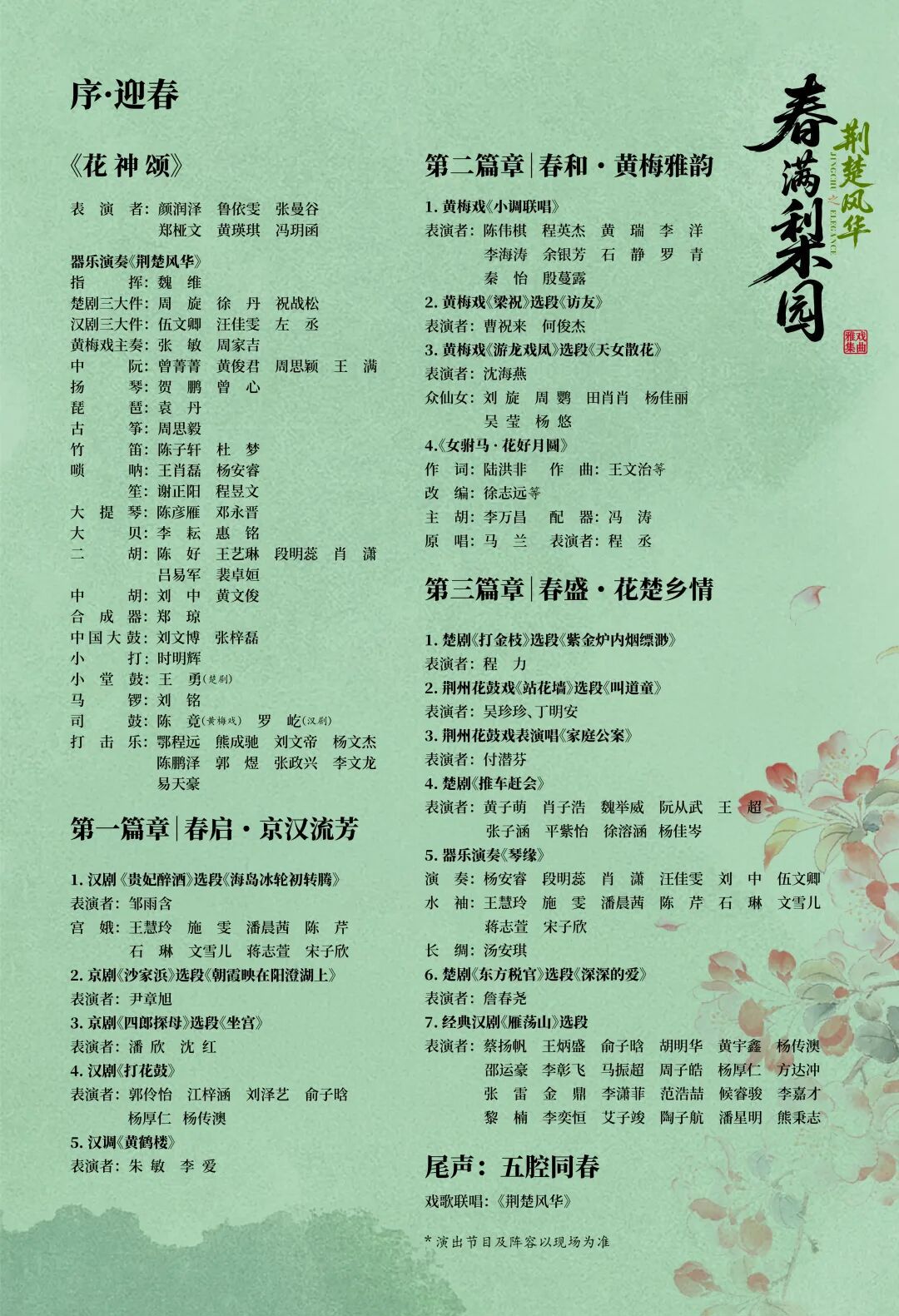 本场演出以《花神颂》与器乐演奏《荆楚风华》拉开帷幕,尾声以五剧种联唱的《荆楚风华》收束全场。总共分为三个篇章:“春启・京汉流芳”包含汉剧《贵妃醉酒》、京剧《四郎探母》《沙家浜》、汉剧《打花鼓》及汉调《黄鹤楼》;“春和・黄梅雅韵”聚焦黄梅戏,上演《小调联唱》《梁祝》《游龙戏凤》《女驸马》选段;“春盛・花楚乡情”则以楚剧《打金枝》《推车赴会》《东方税关》、荆州花鼓戏《站花墙》《家庭公案》,搭配器乐演奏《琴缘》与经典汉剧《雁荡山》。