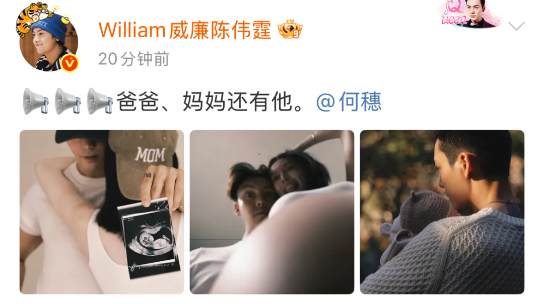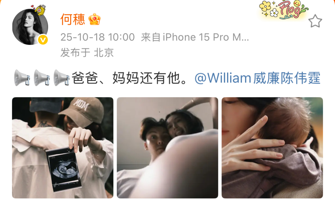 2025年10月18日,何穗、陈伟霆发布微博,官宣生子。