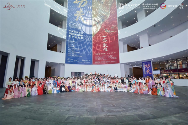 活动当日,多位知名博主参加活动,与汉服爱好者齐聚现场。本次大展策展人王鹏亦身着汉服,化身同袍,全程与爱好者们互动交流。从馆外的国风快闪,到馆内沉浸式舞台演绎,敦煌主题集体舞、霓裳服饰秀、古典舞蹈轮番上演。