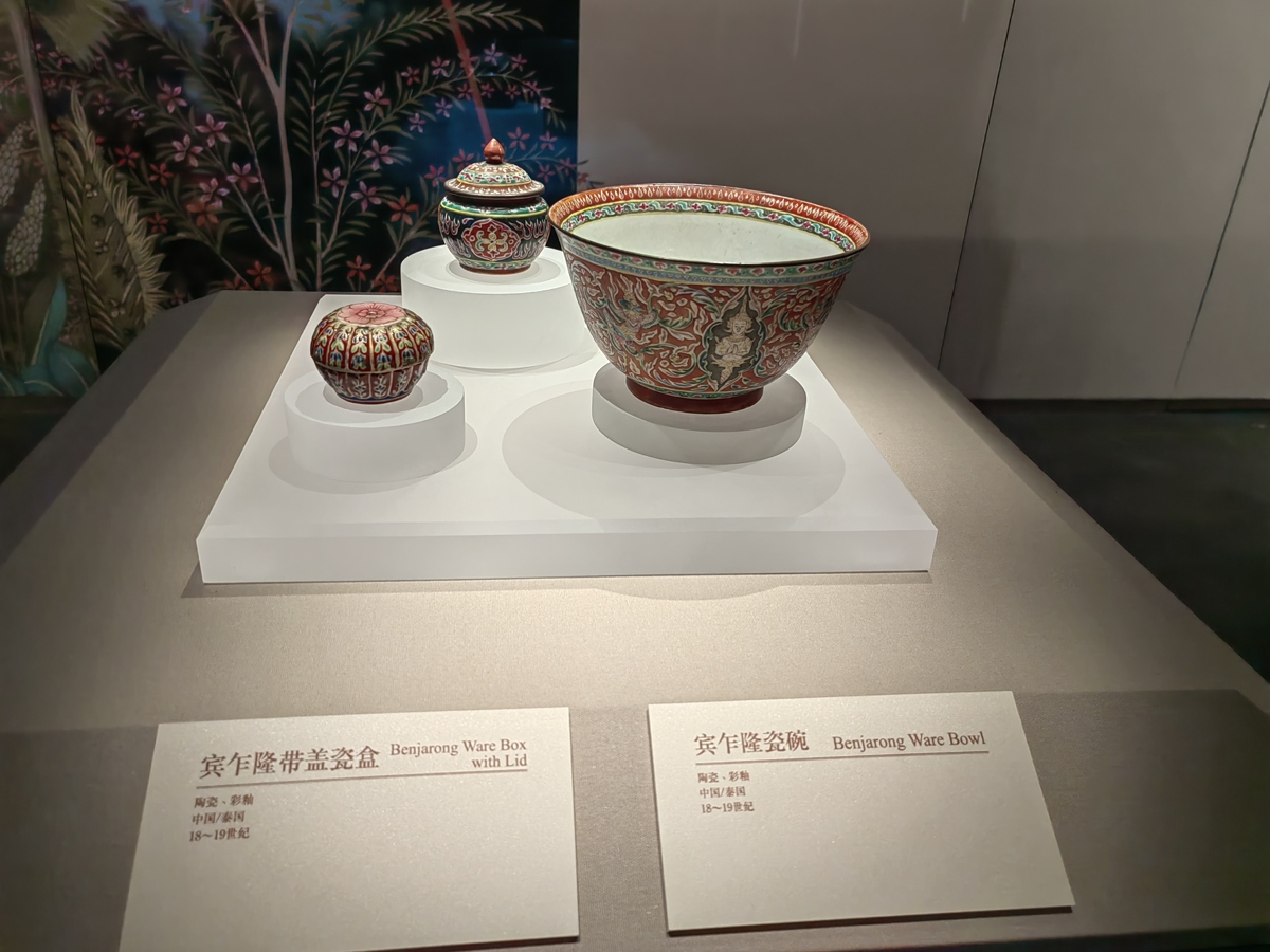 展览中,观众可以看到亚洲不同文化之间的交流与互鉴。魏冕介绍,比如,展厅展示的“宾乍隆瓷器”,“宾乍隆”意为“五彩”,宾乍隆瓷器在18至19世纪深受皇室贵族青睐。装饰华美的“宾乍隆瓷器”将中国、印度与暹罗文化传统融为一体。大部分瓷器据称产自景德镇和广州,但所施珐琅彩为典型泰式风格。东南亚华商负责进口瓷器,但关于彩绘工作,究竟是派泰国工匠前往中国协助进行,还是将泰式彩绘图样送往中国作为参照,抑或在暹罗完成部分绘制,尚不明确。