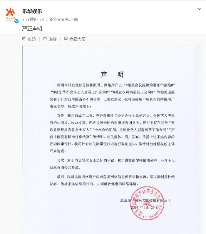 4月29日,乐华娱乐发布声明,全文如下:我司今日发现部分媒体账号、网络用户以“曝吴宣仪提解约遭乐华拒绝”“曝乐华不允许艺人查看工作合同”“吴宣仪母亲被赶出公司”等相关话题发布了针对我司的诸多不实信息,已引发热议。我司为避免不明真相的网络用户遭受误导,特此声明如下: