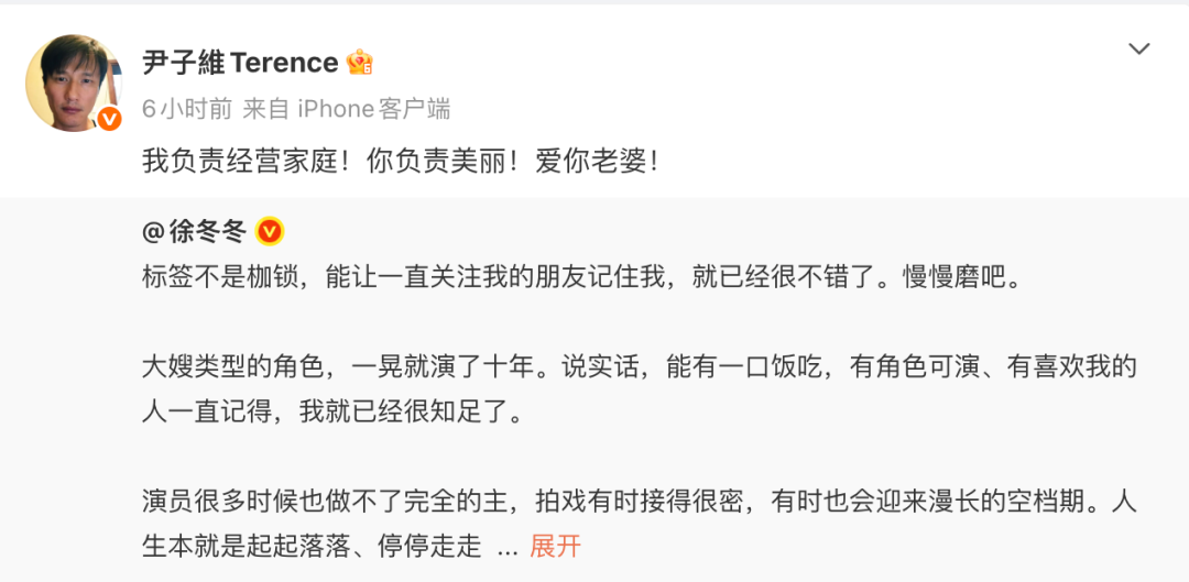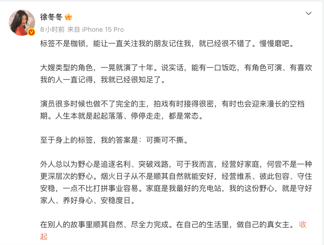 4月29日,@徐冬冬发文回应大嫂标签:标签不是枷锁,能让一直关注我的朋友记住我,就已经很不错了。