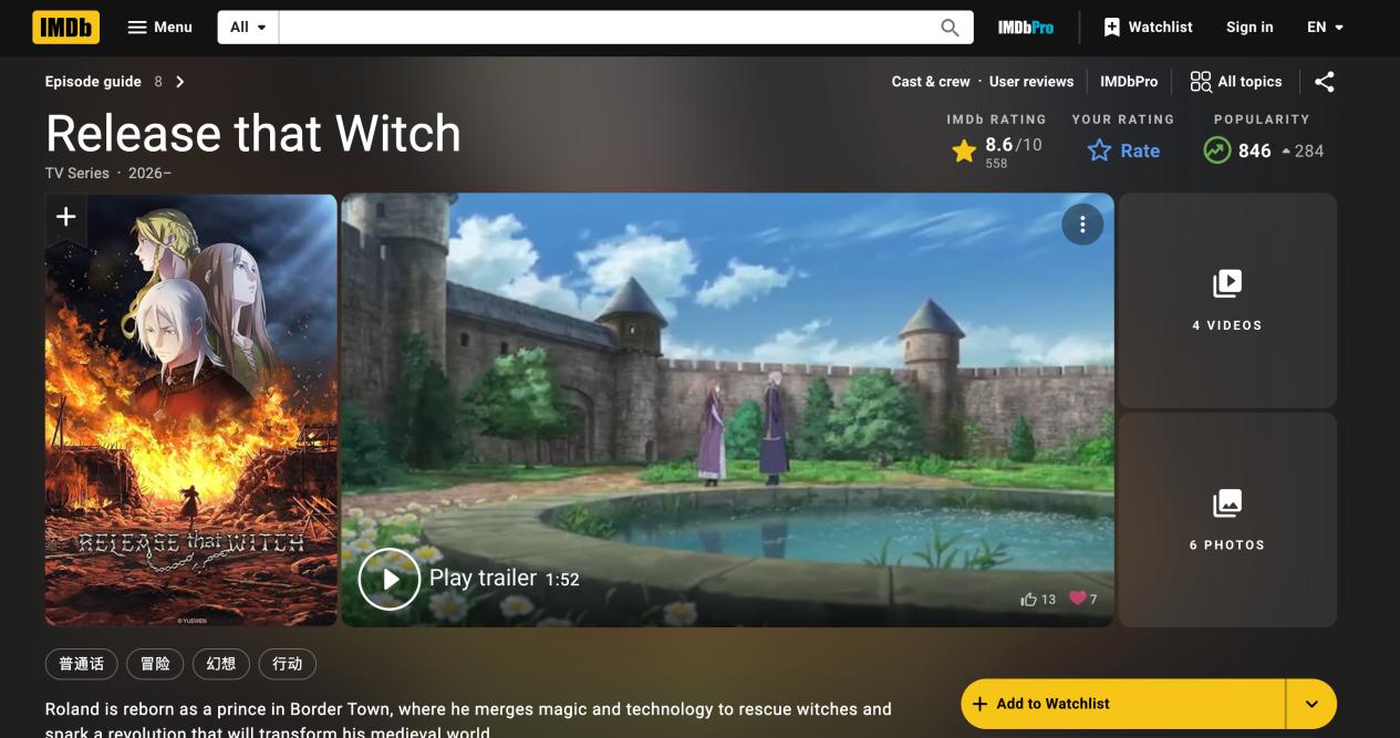 口碑数据同样印证了这一热潮。在Crunchyroll平台上,《放开那个女巫》吸引了超过1.78万名用户参与评分,以4.9分(满分5分)的成绩位居平台高位;在全球权威影视评分网站IMDb上,该作同样收获了8.6分的高分评价,跻身近年来中国动画出海的口碑第一梯队。