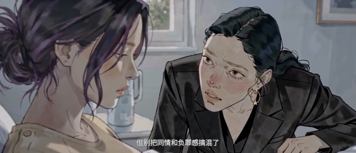 这种人性心理的真实是刘驰在创作中追求的。她坦言,剧本是按分镜头脚本写的,但在制作中为了更好的表现人物内心的挣扎,在制作中还是加入了很多小细节,像是手机拿起来,一开始亮着,然后暗掉,屏幕里反出莉亚的脸。“这就是AI的好处,后期我随时可以改提示词重新跑一条。导演如果实拍说这段戏不行我要重拍,可能就被上黑名单了。”