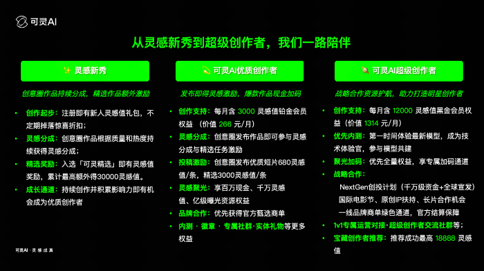 与此同时,“可灵AI创作者计划3.0”还将搭建一套覆盖创作全周期的阶梯式成长体系“灵感新秀计划”为刚起步的创作者提供新人灵感值礼包和分成收益,让每一次创作都能持续产生价值,把最容易流失的“冷启动期”变成“信心养成期”。原有的优质创作者的权益也不断加码:优质创作者每月可获赠可灵铂金会员,精选投稿每条奖励3000灵感值并解锁“灵感聚光计划”;超级创作者每月可享受可灵黑金会员,更可获得战略级合作资源——NextGen创投千万级资金绿色通道、国际电影节展映机会、长片计划合作及1v1专属运营对接。